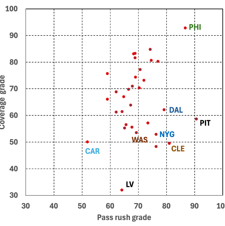 Teams with poor pass coverage, on the other hand, do not benefit from a good pass rush because even when the quarterback sees a pass rusher bearing down, there is already an open receiver to get the ball to. In this scenario, the team coverage grade may only be partly due to the talent of the defensive backs – above some threshold, they are good enough to give the pass rush time to affect the quarterback. That in turn makes the defensive backs’ jobs easier, since they get to make plays before receivers get open more often, thus raising their coverage grade.