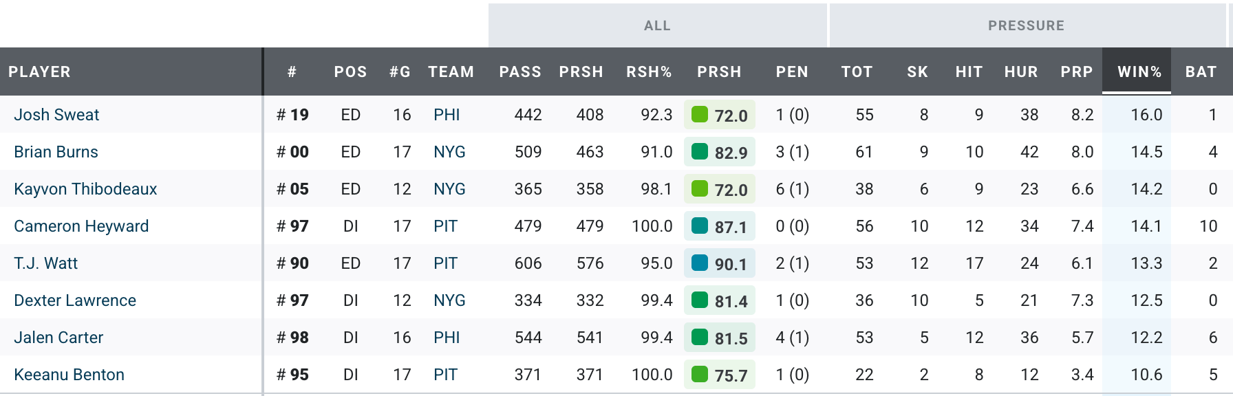 Brian Burns, Kayvon Thibodeaux, and Dexter Lawrence had pass rush win rates every bit as good as the Eagles’ and Steelers’ best, yet only the Eagles had a dominating defense because they had good enough pass coverage to exploit what the players up front were doing: