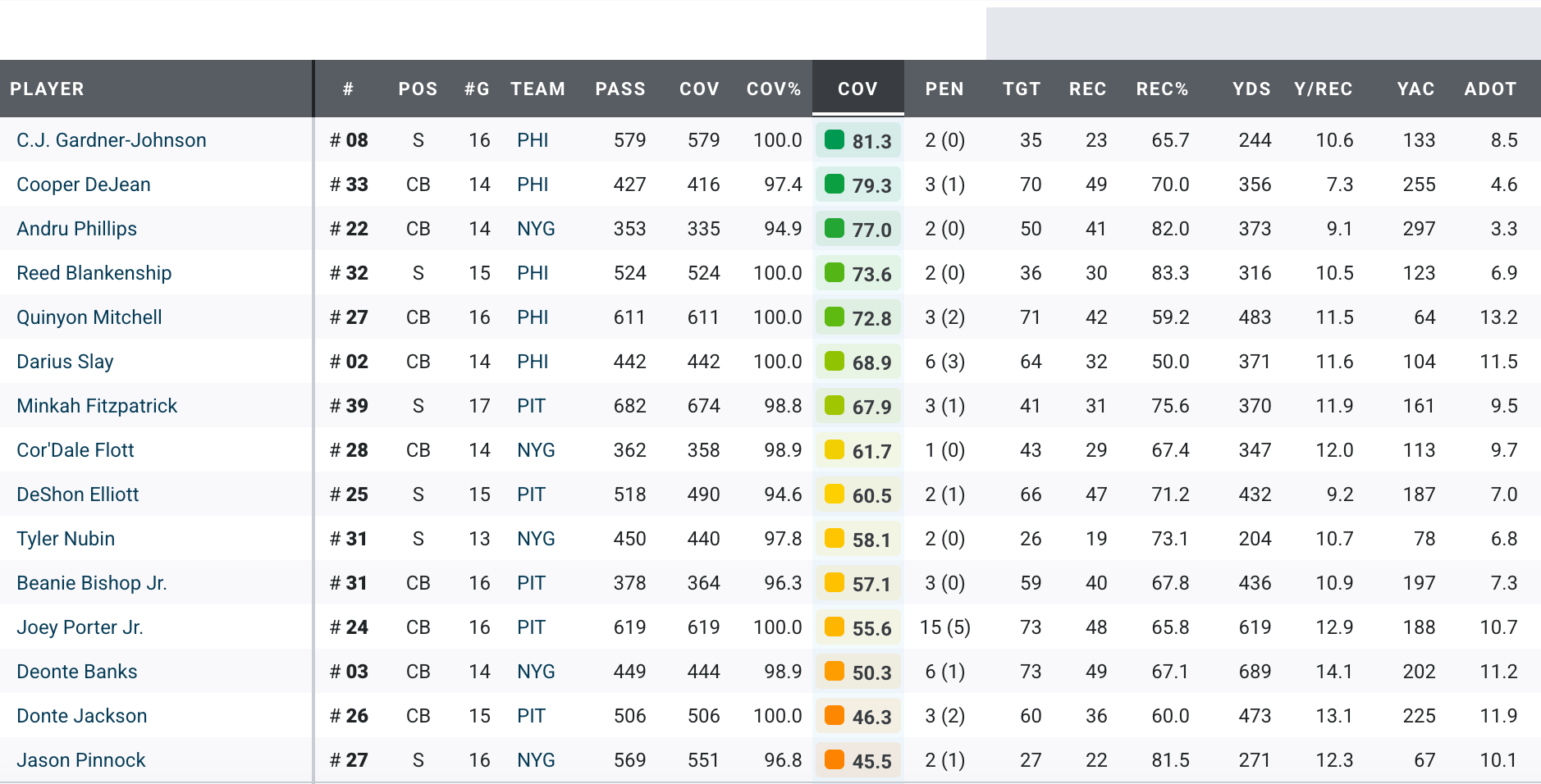 Was every single Eagles defensive back in their regular rotation better in coverage than anyone the Giants and Steelers put out there other than Dru Phillips? Maybe so, according to the ranked PFF coverage grades above. Or maybe the Eagles’ DBs were just good enough to hang with their receivers long enough for the opposing QB to get happy feet anticipating the Eagles’ pass rush. The quarterback sees that the rusher has beat his man and knows he’ll have to get the pass off quickly, but the defensive backs are still in position to make plays, leading to a good coverage grade.