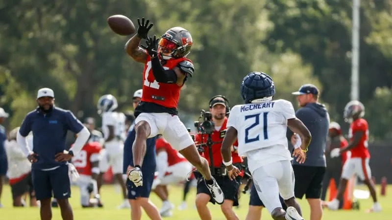But that leaves some very experienced players who have made big contributions to the Bucs’ success battling for the final spots. The list includes Sterling Shepard, Trey Palmer, Rakim Jarrett and Ryan Miller. Garrett Greene, a converted quarterback out of West Virginia, had some good moments against the Titans in practice. The Bucs just signed Nevada receiver Jaden Smith, a 6-foot-6 prospect.