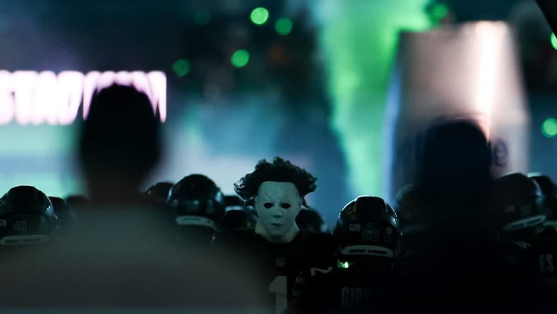 Oct 31, 2024; East Rutherford, New Jersey, USA; New York Jets cornerback Sauce Gardner (1) runs onto the field in a Michael Myers mask before the first half of their game against the Houston Texans at MetLife Stadium. Mandatory Credit: Ed Mulholland-Imagn Images