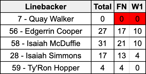 With Quay Walker still recovering from his offseason ankle surgery, the starters in two-linebacker sets against the Jets were Edgerrin Cooper and Isaiah McDuffie. This isn’t always the case, as Isaiah Simmons has gotten looks over McDuffie at various points in practice this summer.