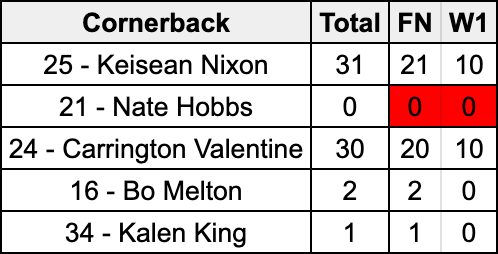 Without Hobbs, the starters were Keisean Nixon, who is going to start outside this year, and Carrington Valentine, who would be brought off the bench in nickel if Hobbs is kicked inside. There’s little to note at this position beyond that. Receiver-turned-cornerback Bo Melton and Kalen King both got work with the second-team defense. It’s worth mentioning here that Kamal Hadden, who some believed was higher than King on the cornerback depth chart before his injury, also didn’t participate in this game.