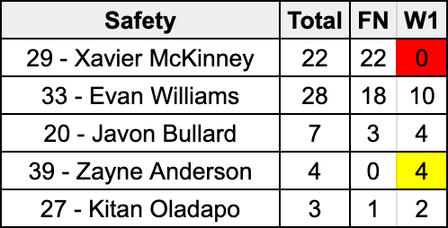 With Bullard playing in the slot and McKinney out, special teams ace Zayne Anderson came off the bench in nickel looks to play safety with the first-team unit opposite of Evan Williams against the Jets. Unfortunately, Anderson went down with what LaFleur described as a knee injury. That’s all the information we have on that issue at this time. When Anderson dropped out of action, Kitan Oladapo stepped up in his place.