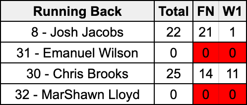 With Emanuel Wilson (knee) and MarShawn Lloyd (groin) out with injuries for both Family Night and Week 1 of the preseason, it’s been Josh Jacobs and Chris Brooks seeing action with the first-team offense. Tonight, Jacobs got the ceremonial first snap of the game and then was immediately put in bubble wrap. Brooks got on the field for all of the other 11 snaps.