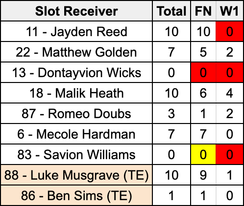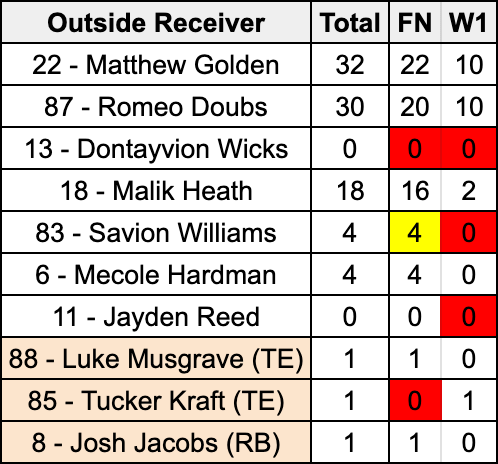 Either way, rookie first-round pick Matthew Golden and Romeo Doubs played 10 snaps of outside receiver each. The only other receiver to line up wide was Malik Heath, a kick return unit contributor, who played two snaps on the perimeter. It’s worth noting here that Heath got an opportunity over Mecole Hardman, a roster bubble return specialist, who was also outsnapped 16-4 on the outside by Heath on Family Night.