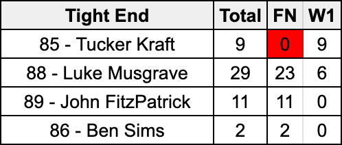 Tucker Kraft missed Family Night with a groin injury but returned to outsnap Luke Musgrave nine to six at true tight end positions. Kraft also got a rep split outside, and Musgrave got one in the slot. If there’s anything to take away from how the Packers used their tight ends in Week 1 of the preseason, it’s that they still like getting both of them on the field. Out of 12 snaps, Green Bay was in 12 personnel (two tight end sets) bout half the time.