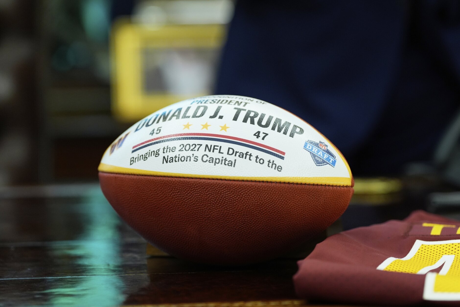 Trump Washington Commanders owner Josh Harris, from left, and NFL Commissioner Roger Goodell watch as a football is presented to President Donald Trump during an event to announce that the 2027 NFL Draft will be held on the National Mall, in the Oval Office of the White House, Monday, May 5, 2025, in Washington. (AP Photo/Alex Brandon)