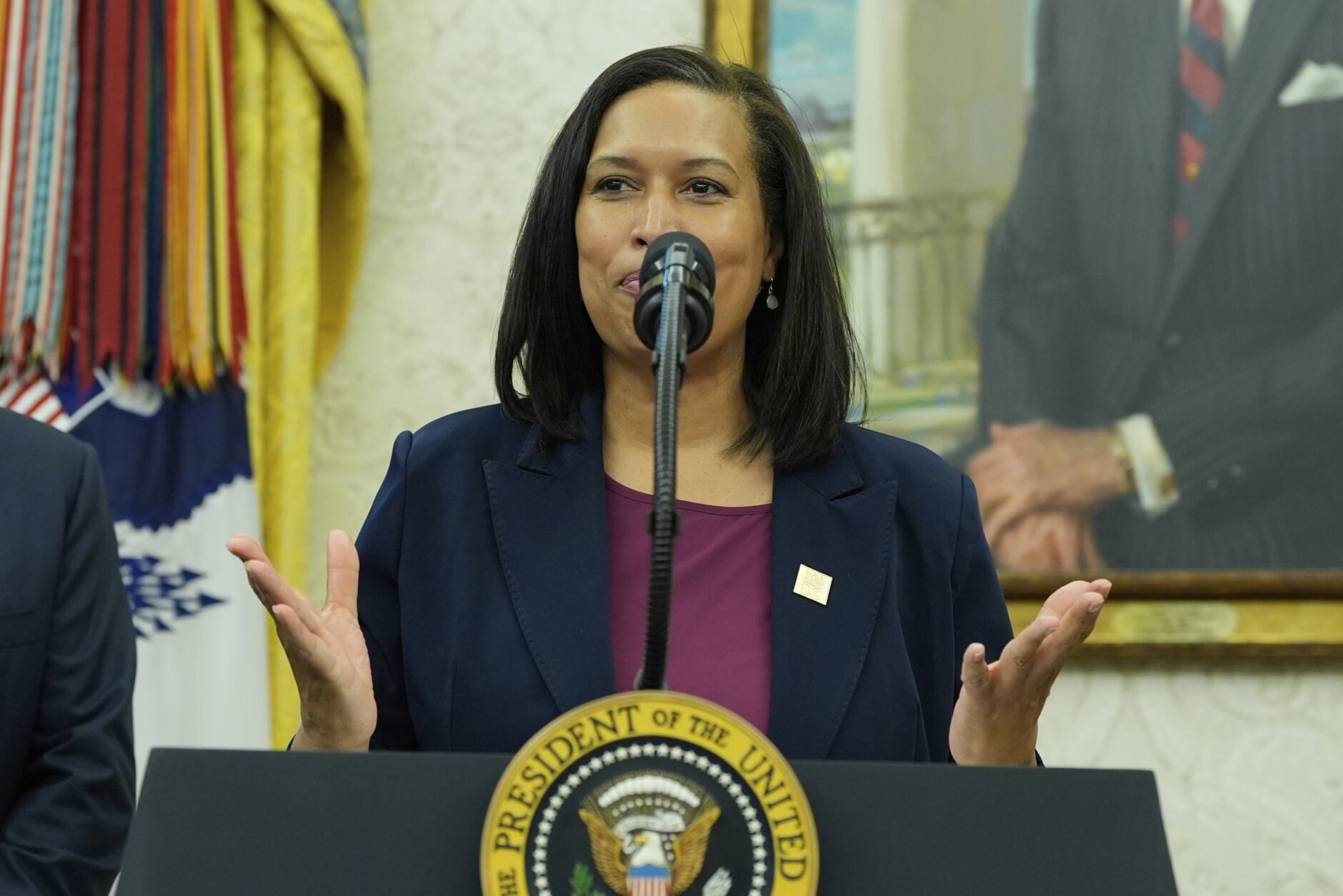 Trump District of Columbia Mayor Muriel Bowser speaks during an event where President Donald Trump announces that the 2027 NFL Draft will be held on the National Mall, in the Oval Office of the White House, Monday, May 5, 2025, in Washington. (AP Photo/Alex Brandon)