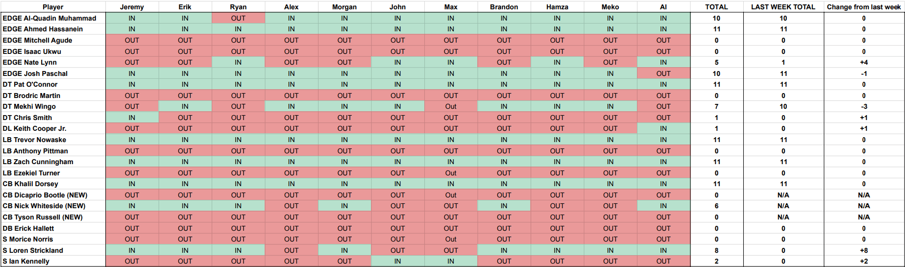 Assumed in: Aidan Hutchinson, Marcus DavenportAhmed Hassanein: 11 “IN” votes (no changeAl-Quadin Muhammad: 10 votes (no change)Josh Paschal: 10 votes (down 1)Nate Lynn: 5 votes (up 4)Mitchell Agude: 0 votes (no change)Isaac Ukwu: 0 votes (no change)