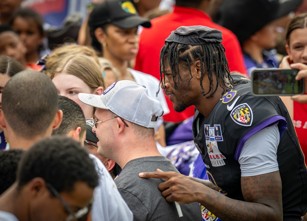 Quarterback Lamar Jackson takes a photo with a fan following practice on Aug. 5. (Jerry Jackson/The Baltimore Banner)