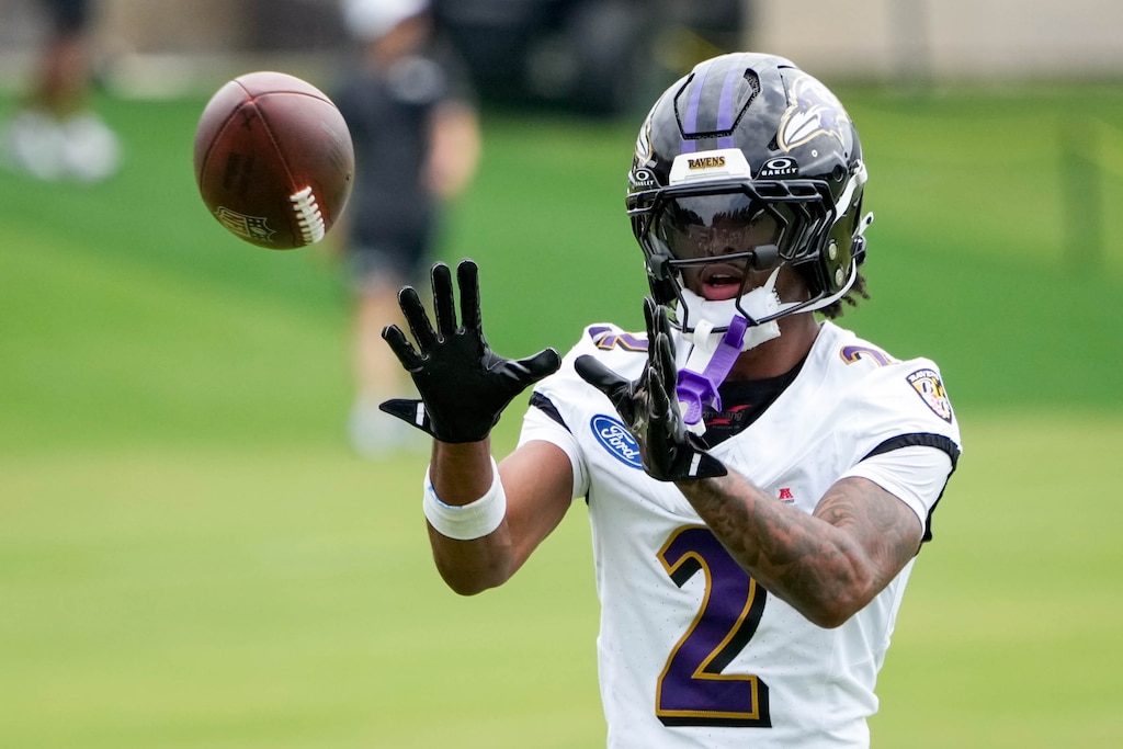 Cornerback Nate Wiggins (2) catches a pass during practice on July 24. (Ulysses Muñoz/The Baltimore Banner)