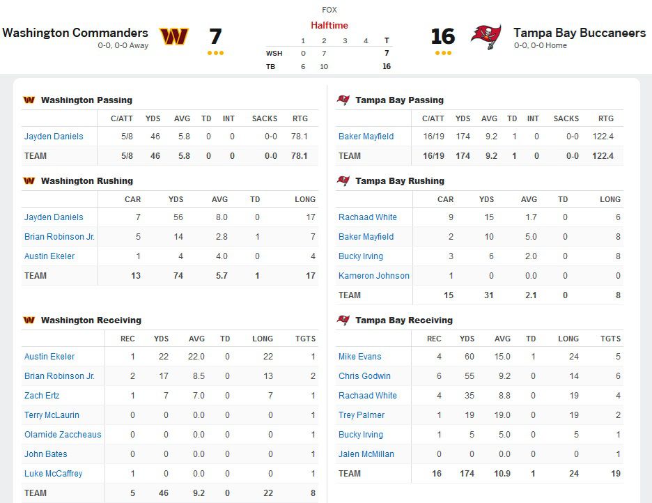 Jayden Daniels started strong with a 9-yard completion to tight end Zach Ertz, his second reception of the day. A good run by Brian Robinson set up a fresh set of downs at the Tampa 46, after which Terry McLaurin tallied his first reception of the game on a short catch & run for 6 yards.
