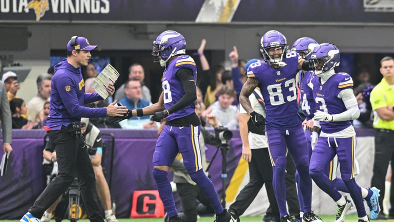 Dec 8, 2024; Minneapolis, Minnesota, USA; Minnesota Vikings head coach Kevin O’Connell reacts with wide receiver Justin Jefferson (18), wide receiver Jalen Nailor (83) and wide receiver Jordan Addison (3) after a touchdown reception against the Atlanta Falcons during the second quarter at U.S. Bank Stadium. Mandatory Credit: Jeffrey Becker-Imagn Images
