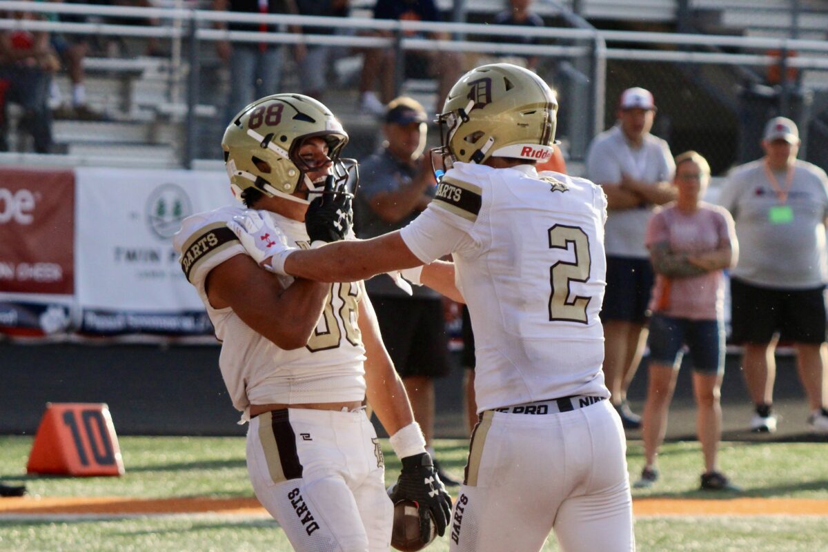 The Boise State commit launched his senior season Thursday night, completing 31 of 38 passes for 384 yards and five touchdowns — three alone in the first quarter — in leading the Darts to a 1-0 start with a domineering, 56-21 win over Brighton at Freestone Field.