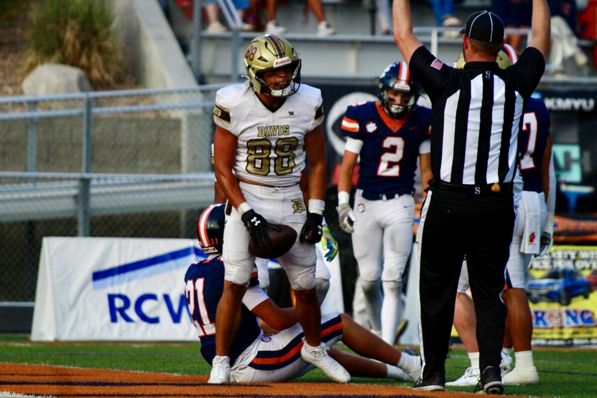 Davis High’s Jaxton Itaaehau (88) celebrates a touchdown against Brighton on Thursday, Aug. 14, 2025, in Cottonwood Heights.