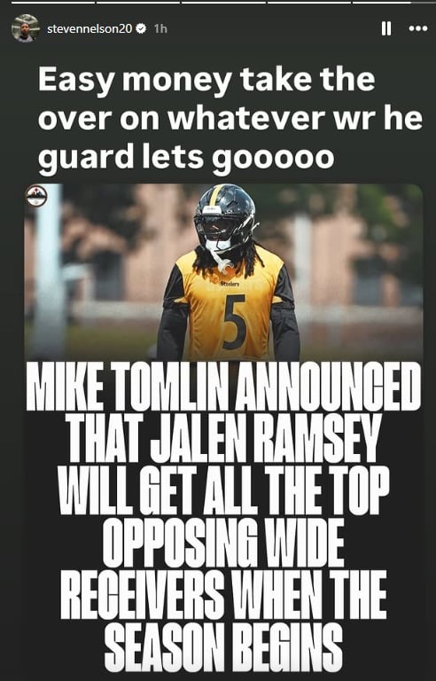 “Easy money take the over on whatever WR he guard lets gooooo,” Nelson wrote in caption regarding Mike Tomlin’s announcement that Ramsey will handle the WR1 matchups this year.