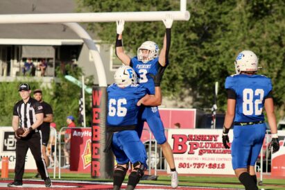 Fremont’s Cooper Allen, left, celebrates a touchdown with Cade Hadley, center, during a non-region football contest at Weber on Friday, Aug. 15, 2025, in Pleasant View.