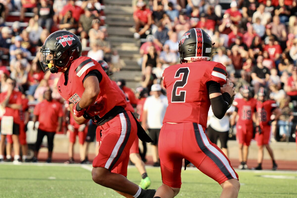 Weber’s Dyson Parker, left, and Carter Payne execute a false handoff during a non-region football contest at Weber on Friday, Aug. 15, 2025, in Pleasant View.