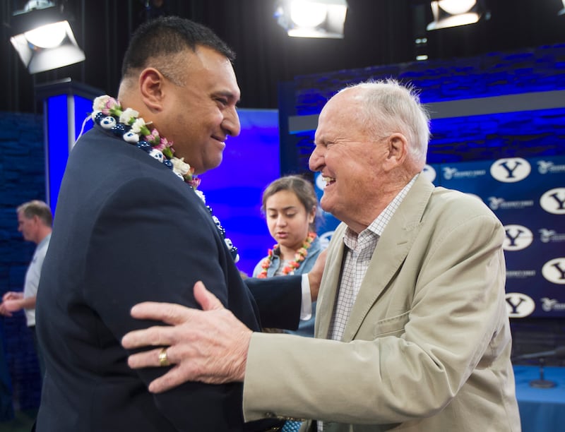 BYU’s newest head football coach Kalani Sitake talks briefly with former head coach LaVell Edwards following a press conference in Provo Monday, Dec. 21, 2015. | Scott G Winterton, Deseret News