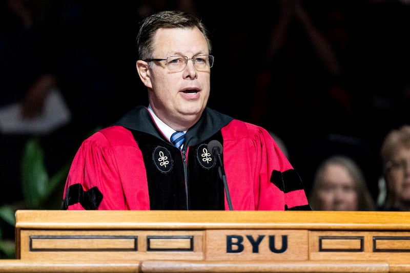 Elder Clark G. Gilbert, a General Authority Seventy of The Church of Jesus Christ of Latter-day Saints and commissioner of the Church Educational System, gives the commencement address during Brigham Young University’s commencement ceremony, held at the Marriott Center in Provo on Thursday, April 24, 2025. | Isaac Hale, Deseret News