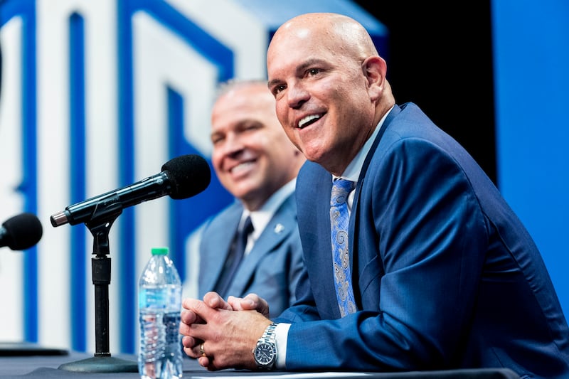 Newly-named Brigham Young University Director of Athletics Brian Santiago speaks as he’s joined by BYU President C. Shane Reese during a press conference announcing Santiago’s hiring for the position held at the BYU Broadcast Building on the university’s campus in Provo on Wednesday, May 14, 2025. | Isaac Hale, Deseret News