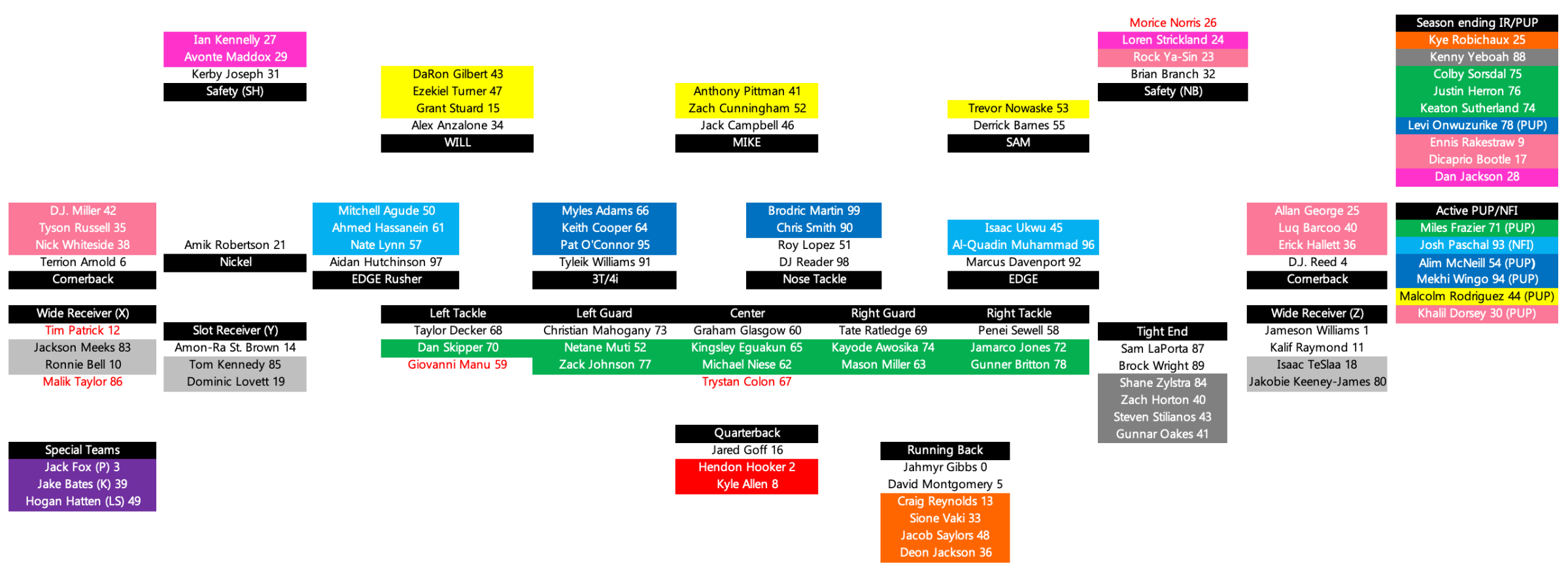 I’ve shifted Ya-Sin to the safeties group this week, as he continues to take reps there to gain experience. I don’t believe this will be a permanent positional switch, but he’s playing well enough that he is making himself a coveted player. With Norris still in concussion protocol, Maddox could shift out of the slot and back into a pure safety role in this game. However, if the Lions elect to continue to use him as a slot option, a rotation of Strickland and Kennelly could be in order.