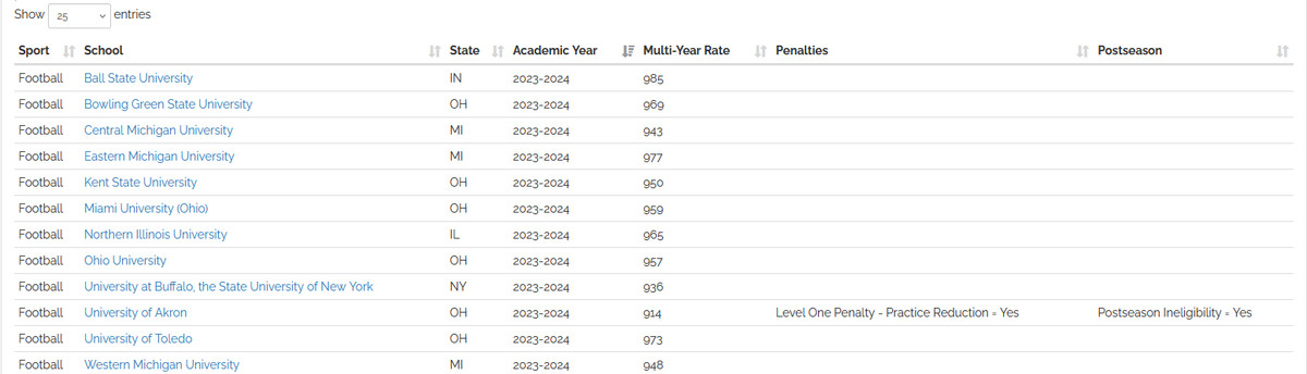 The screenshot below — also from the NCAA — shows Akron’s APR in 2023-24’s academic calendar compared to their peers in the Mid-American Conference: