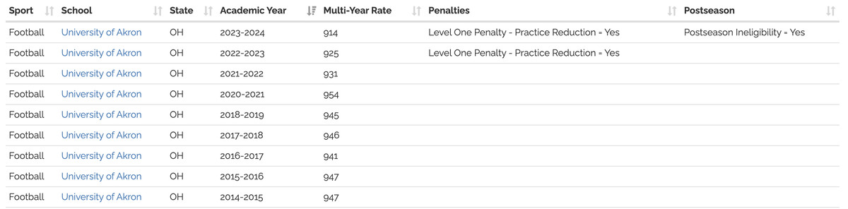 Akron’s rolling four-year APR reported through the 2023-24 academic calendar was 914, falling 16 points shy of the mandated score. The screenshot below from the NCAA website shows Akron’s four-year APRs, including penalties and postseason restrictions: