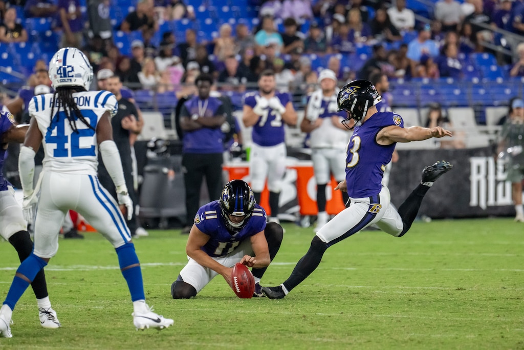 Tyler Loop (33) kicks a 52-yard field goal in the fourth quarter against the Indianapolis Colts in the Ravens’ first preseason game. (Jerry Jackson/The Baltimore Banner)