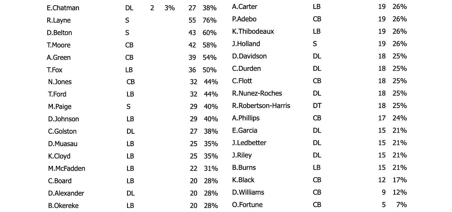 Unlike offense, where players at specific positions have mostly specific roles, on defense, everyone’s trying to tackle, many are trying to cover, and many are trying to stop the run, so there is no easy way to group them. Let’s just begin with the players who played the best overall: