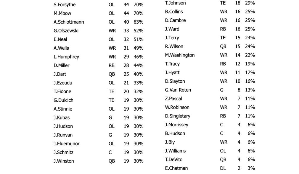 The most notable offensive development was defensive tackle Elijah Chatman getting two snaps at fullback.As was the case last week, all four quarterbacks played, though DeVito only got one series. The highlight of the evening was Dart being thrown in for one play unexpectedly.The starting offensive linemen (including interim starting LT James Hudson III) got 19 snaps except for Greg Van Roten, who only had 8. Evan Neal played with the starters in his place.Darius Slayton and Jalin Hyatt saw their first action but only for a limited number of snaps. Most of the receiving snaps went to Gunner Olszewski, Juice Wells, and Lil’Jordan Humphrey, with Beaux Collins, Dalen Cambre, and Montrell Washington playing a decent number of snaps and Zach Pascal, Wan’Dale Robinson, and Jordan Play playing less.Daniel Bellinger did not play. The other four tight ends (Theo Johnson, Thomas Fidone II, Greg Dulcich, and Jermaine Terry) saw roughly equal amounts of action.