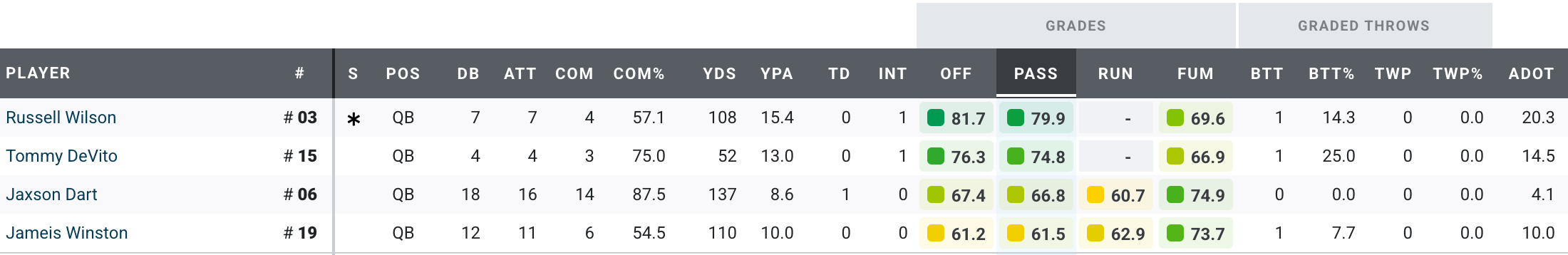 Giants’ quarterbacks had three big-time throws last night, with Russell Wilson (81.7) leading the pack due mainly to his moon ball to Beaux Collins. Tommy DeVito (76.3) and Jameis Winston (61.2) had their own big plays. Jaxson Dart (67.4) had a highly efficient though unspectacular evening compared to his first game, but he was 14 of 16 with the only TD pass of the game.