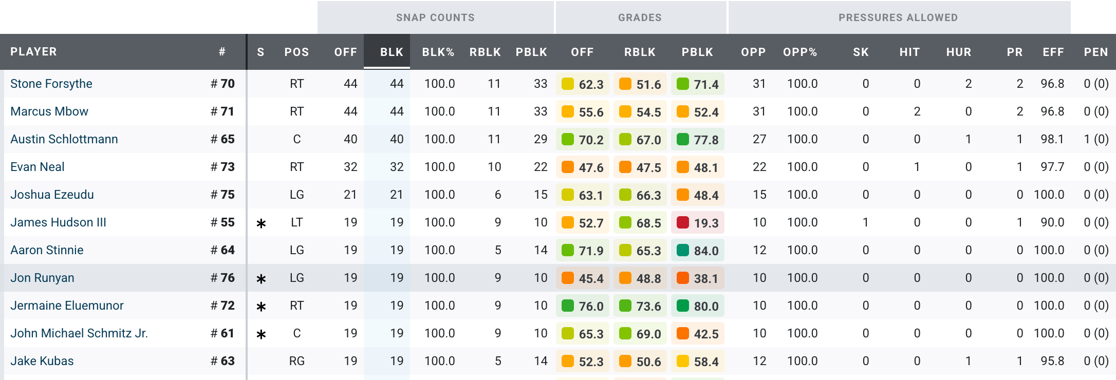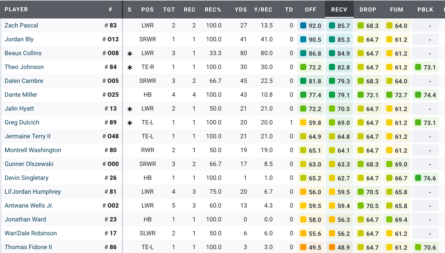 Welcome to the New York Giants, the home of elite NFL wide receivers. Zach Pascal graded 85.7 for his two receptions in two targets for 27 yards, while Jordan Bly (85.3) had only one catch on one target, but it was a 41-yard beauty from Tommy DeVito. Beaux Collins (84.9) had the catch-and-run that everyone will remember, an 80-yarder that just missed being a TD on Russell Wilson’s first moon ball as a Giant. Dalen Cambre (79.3) would not be denied either, with two catches in three targets for 45 yards. Who needs Malik Nabers?