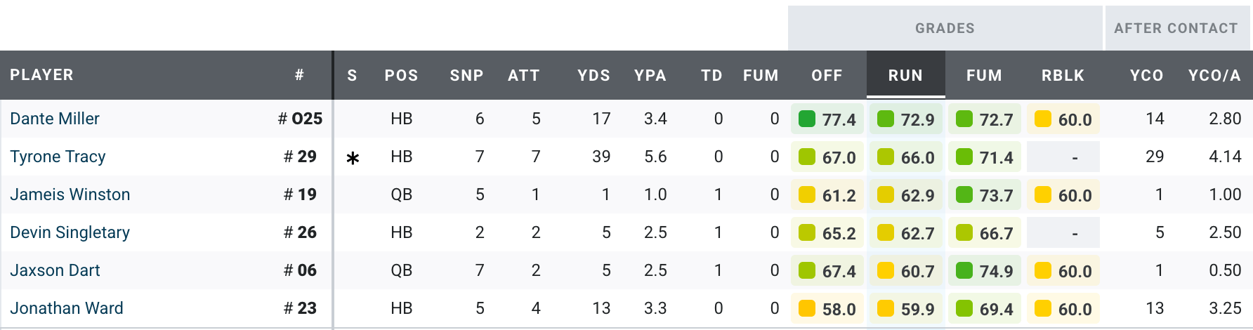 Miller made hay last night as a runner as well (72.9), with 17 yards in five attempts. The other running backs had average grades. Worth noting, though, is the 29 yards after contact (YCO) by Tyrone Tracy, continuing what we saw from him last year, as well as the 14 YCO by Miller and the 13 YCO by Jonathan Ward.