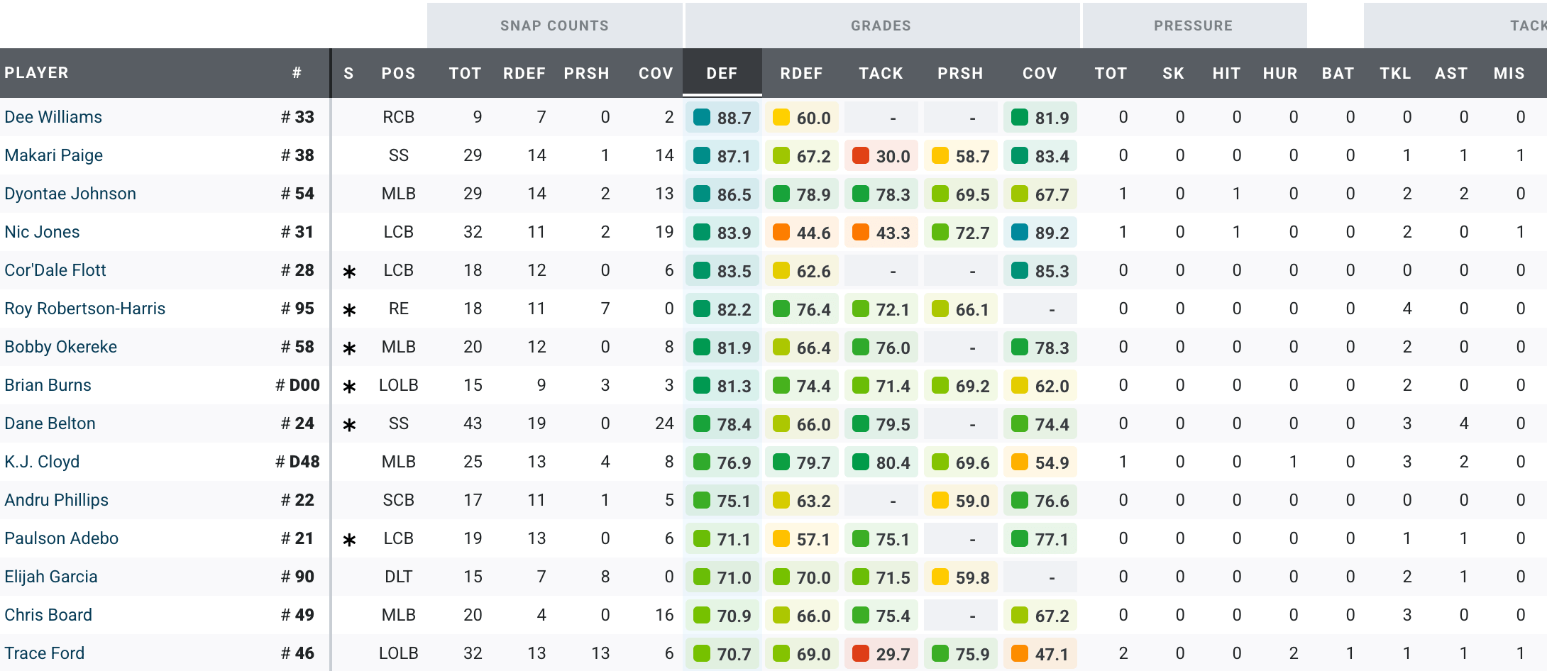 Those were the good grades. Here are the rest of the defense’s grades, the average, the mediocre and the ugly: