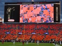 The fans under the massive television screen were given orange cards for a showy presentation at Empower Field at Mile High before a preseason game on Saturday, Aug. 16, 2025.