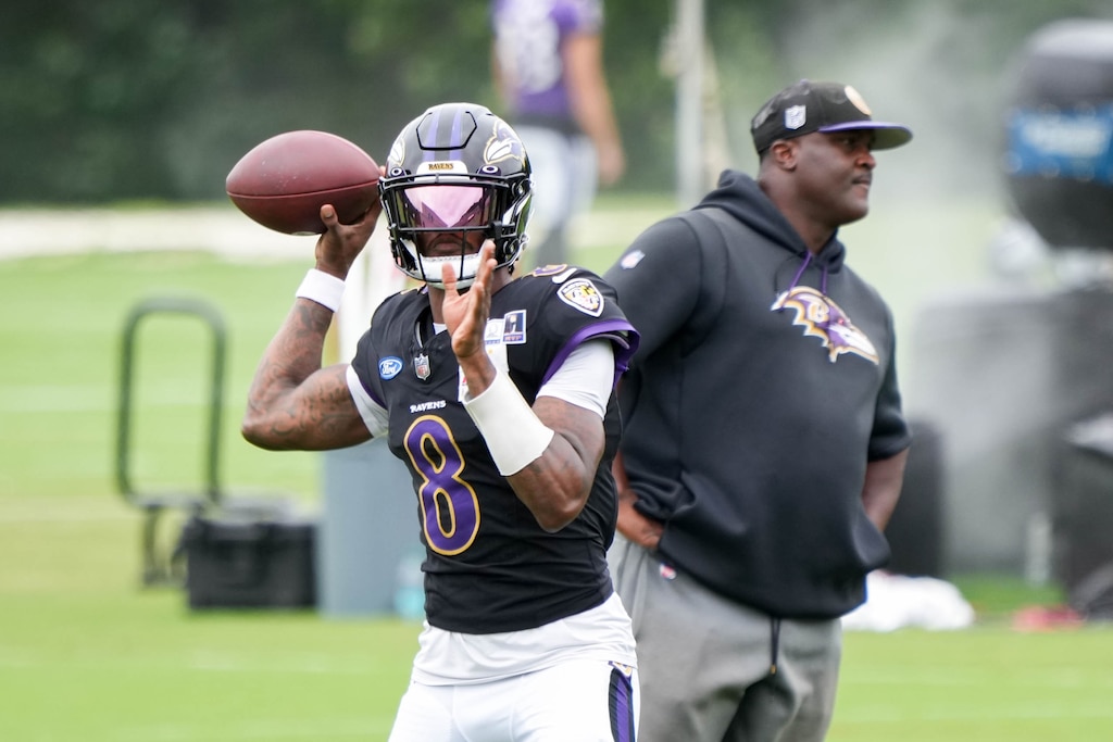 Quarterback Lamar Jackson (8) throws a pass during Tuesday’s training camp. (Ulysses Muñoz/The Baltimore Banner)