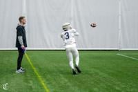 Wide receiver Koby Howard (3) catches a pass while assistant wide receivers coach Mark Dupuis watches at Penn State football practice in Holuba Hall on Tuesday, April 8, 2025 in University Park, Pa.
