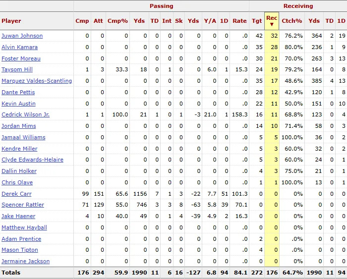 Did current Seahawks offensive coordinator Klint Kubiak really figure out how to use MVS or did the Saints have no other choice because their other top receivers were hurt? These were the receptions leaders from Valdes-Scantling’s time in New Orleans: