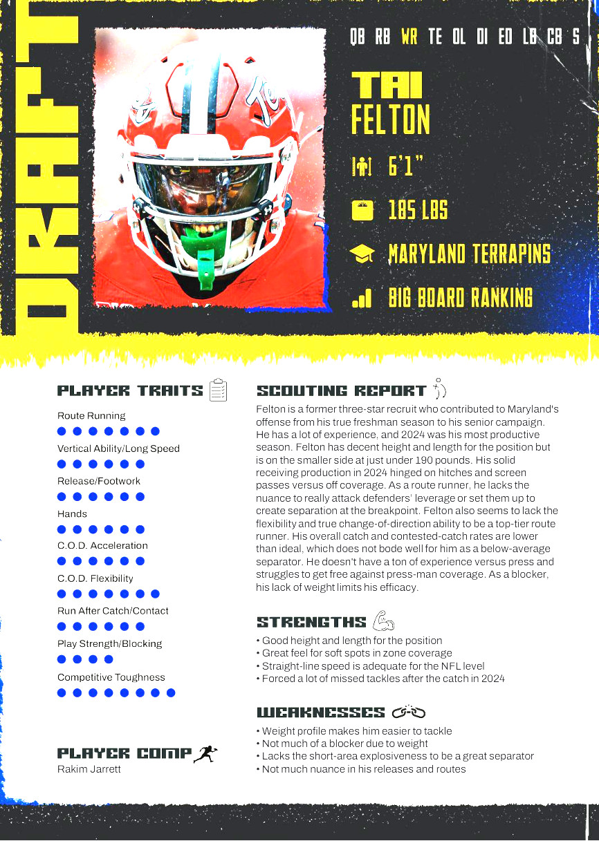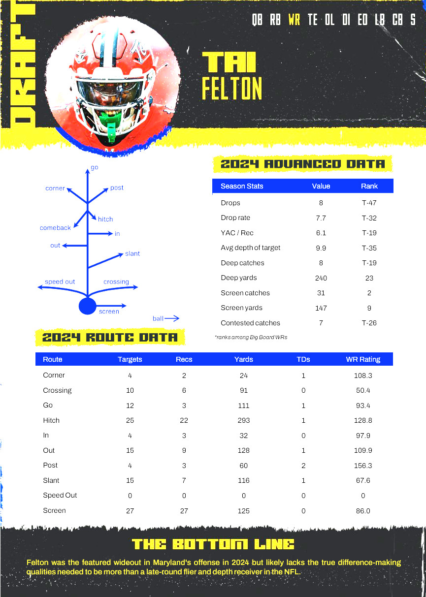 Maryland Terrapins wide receiver Tai Felton projects as an impactful slot receiving option at the NFL level. Felton enjoyed a major breakout campaign in 2024 as the primary target for Maryland’s passing game, receiving opportunities vertically down the field, from the slot, and working as a crafty route runner in the shallow areas of the field.