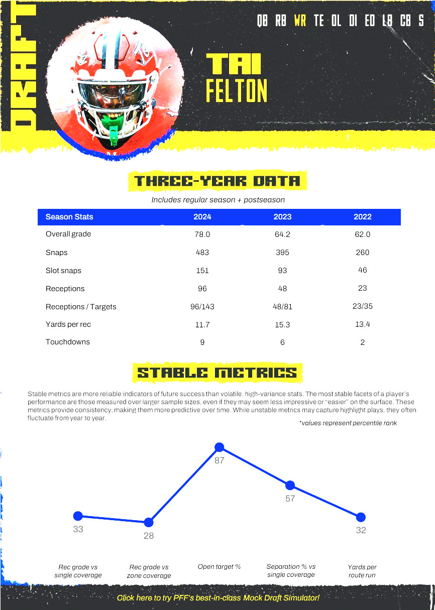 Felton is a lean pass catcher who offers the burst, separation quickness, and creativity with the ball in his hands to warrant a meaningful role down the road with his NFL team. Felton has been steadily improving throughout his career, culminating in a record-setting performance in 2024 that saw Felton set a program record for receptions in a single season.