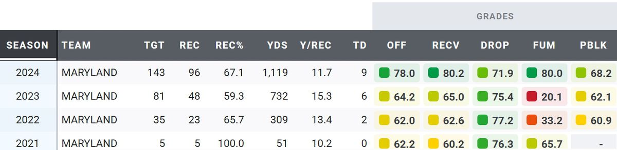 Felton is 6’1” and brings sub-4.4” speed to the table. He’s a little light at 183 pounds but that’s not a major issue (he’s ten pounds heavier than Jordan Addison). He’s also a very good route runner with good footwork, very good after the catch, and is also quick in his movements. He also had a lot of production last season at Maryland. But where he struggles at times is at the catchpoint. He had a relatively high drop rate at 7.7% (although same as Tetairoa McMillian who was drafted #8) last season and didn’t fare all that well in contested catch situations (38.9% catch rate). The big issue here is poor technique at times, which makes it more difficult for him to make the catch and/or makes it easier for the defender to break up the reception.