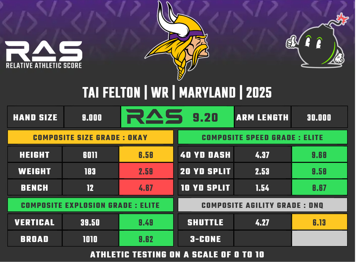 With the 102nd pick in the 2025 NFL Draft, the Minnesota Vikings selected Tai Felton, WR, Maryland. Felton was ranked #126 on the consensus board and was the 16th ranked wide receiver. He was the 14th wide receiver selected in the draft.