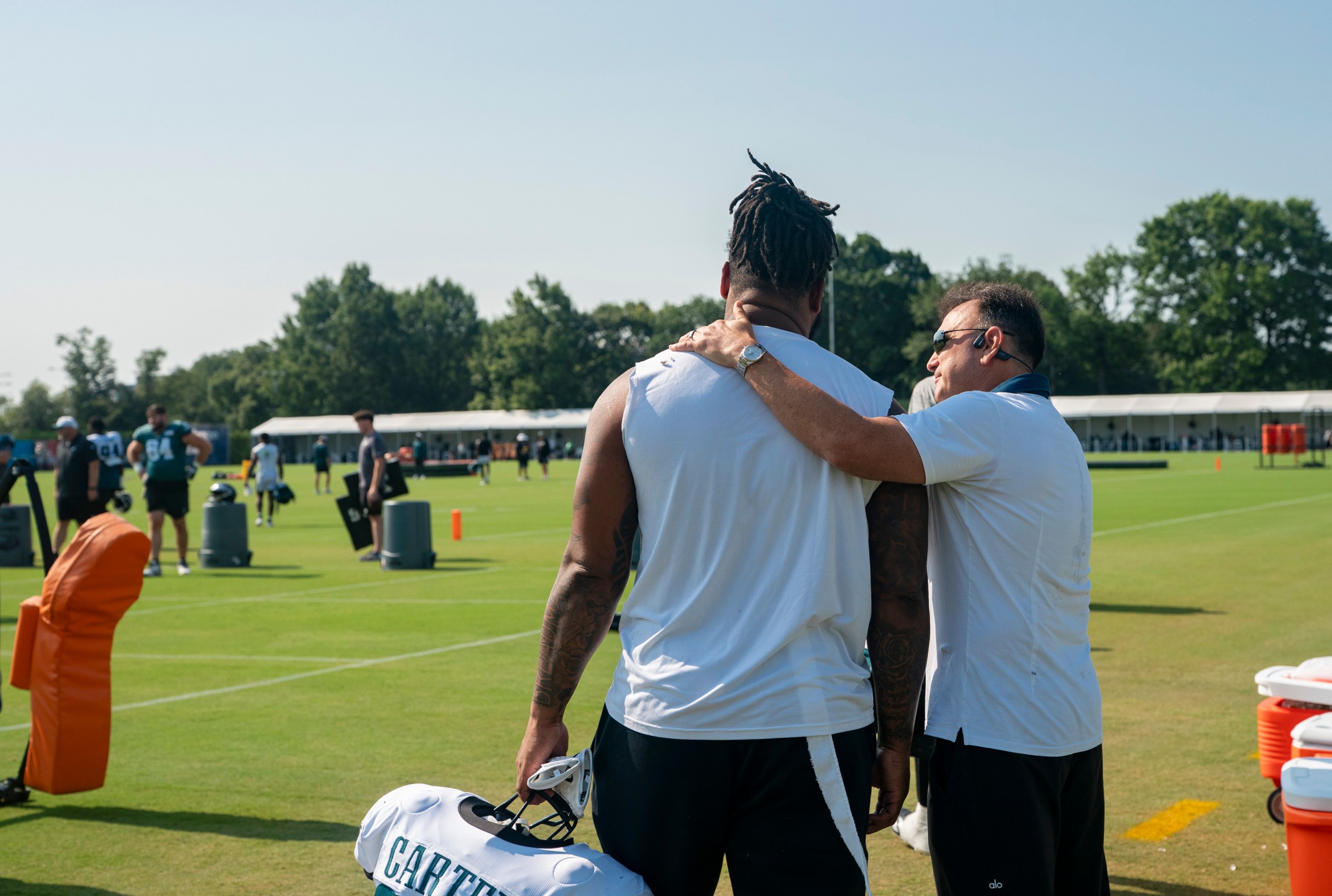 Carter was chatting it up with his agent, Drew Rosenhaus, before practice one day (pictured below courtesy of Bleeding Green Nation photographer Holden Blanco).