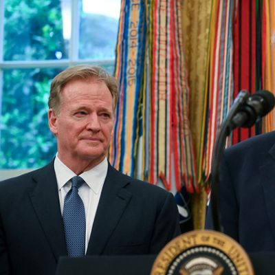 Like the rest of us, Goodell has been dealing with the problem of Donald Trump for a decade now. The president was responsible for one of the most serious crises of Goodell’s nearly 20-year reign as commissioner when Trump, during his first term, blasted the league for “allowing” players to kneel during the national anthem and demanded that NFL owners “yank the sons of bitches off the field.” Amid declining ratings, Trump’s intervention pulled the NFL into a political minefield it wanted nothing to do with. The episode was such a disaster that Goodell called an emergency meeting with various owners, executives, and players to chart a path forward. “To me, this is like a glacier moving into the ocean,” Buffalo Bills owner Terry Pegula said, mixing a couple of oceanic metaphors. “We’re getting hit with a tsunami.” The waters got so tumultuous in 2020 that Goodell actually uttered the words “Black Lives Matter” during the 2020 NFL Draft. (Another perfect example of Goodell surfing the political winds to and fro: He did that at the exact moment it benefitted him and the league and then instantly scampered away. It is impossible to imagine Goodell ever saying those words again.) When Trump left office, Goodell was mostly able to yank the NFL out of the political maelstrom and get it back to printing money with few clouds of controversy hanging over it. Regardless of the commissioner’s personal politics (he’s married to a former Fox News anchor), there is no question that his life was easier with Trump out of office.