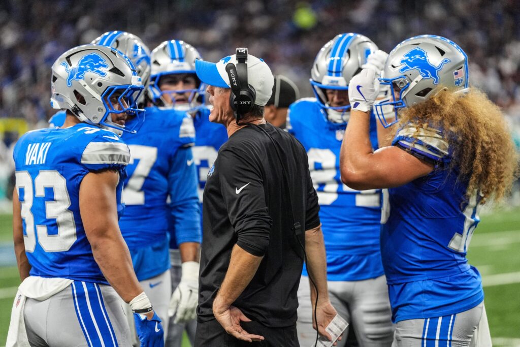 Detroit Lions special teams coordinator Dave Fipp huddles with players before going back onto the field during the first quarter of the preseason game at Ford Field in Detroit, Saturday, Aug. 16, 2025.