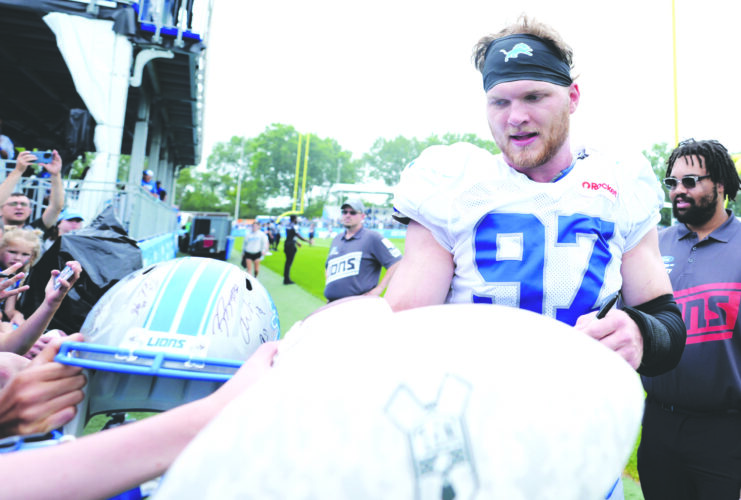 Detroit Lions defensive end Aidan Hutchinson signs autographs during Back Together Weekend at a team training camp on July 26 in Allen Park. (AP file photo)
