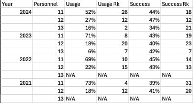 Given Smith’s long-standing use of 13 personnel, I’d expect Pittsburgh to continue heavily using it in 2025. It must be more efficient and successful.
