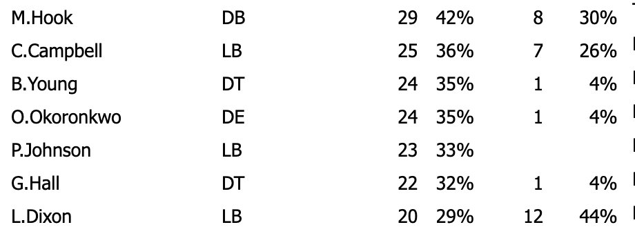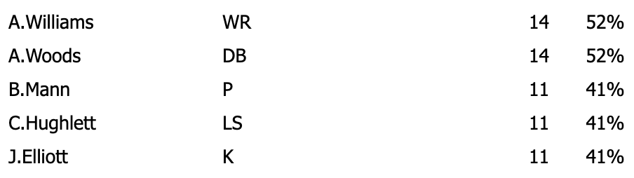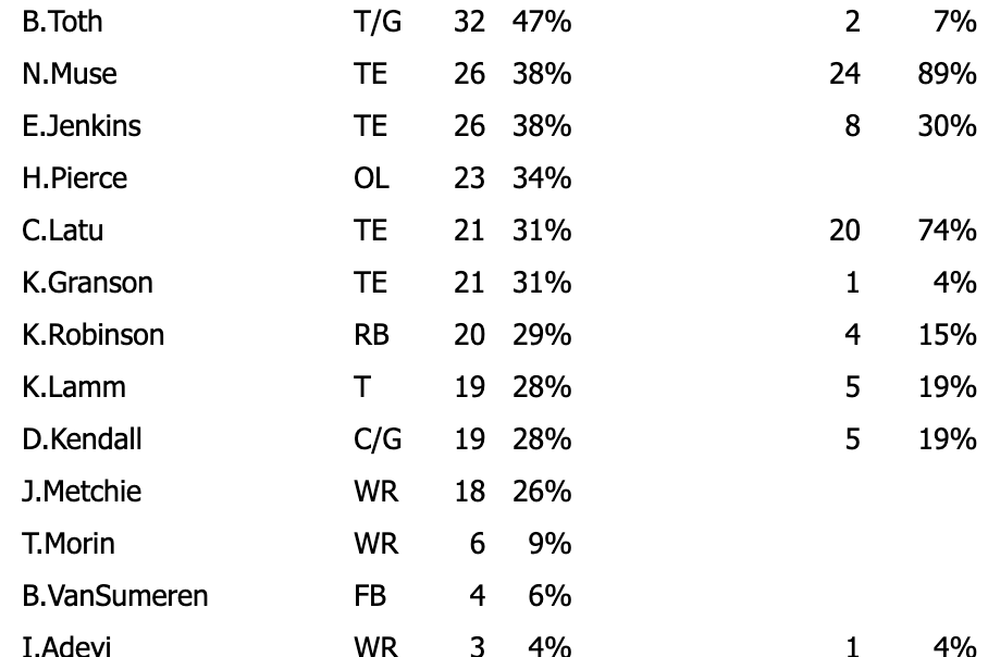 Not much playing time for bottom of the roster guys Taylor Morin (who I could see making the practice squad), Ife Adeyi, and ShunDerrick Powell (not included in the picture above but he played two snaps on offense and zero on special teams).